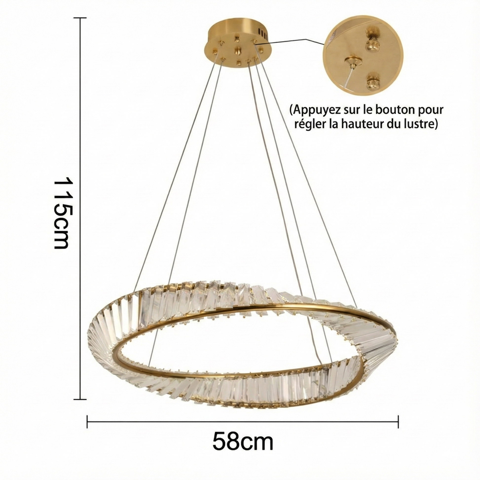 Le lustre LED anneau cristal doré combine une structure en acier inoxydable doré et un anneau de cristaux transparents pour créer un éclairage décoratif au-dessus d’une table de salle à manger, d’un salon ou d’une chambre. Les câbles de suspension ajustables permettent d’adapter la hauteur du luminaire en fonction de la pièce et de la hauteur de plafond.