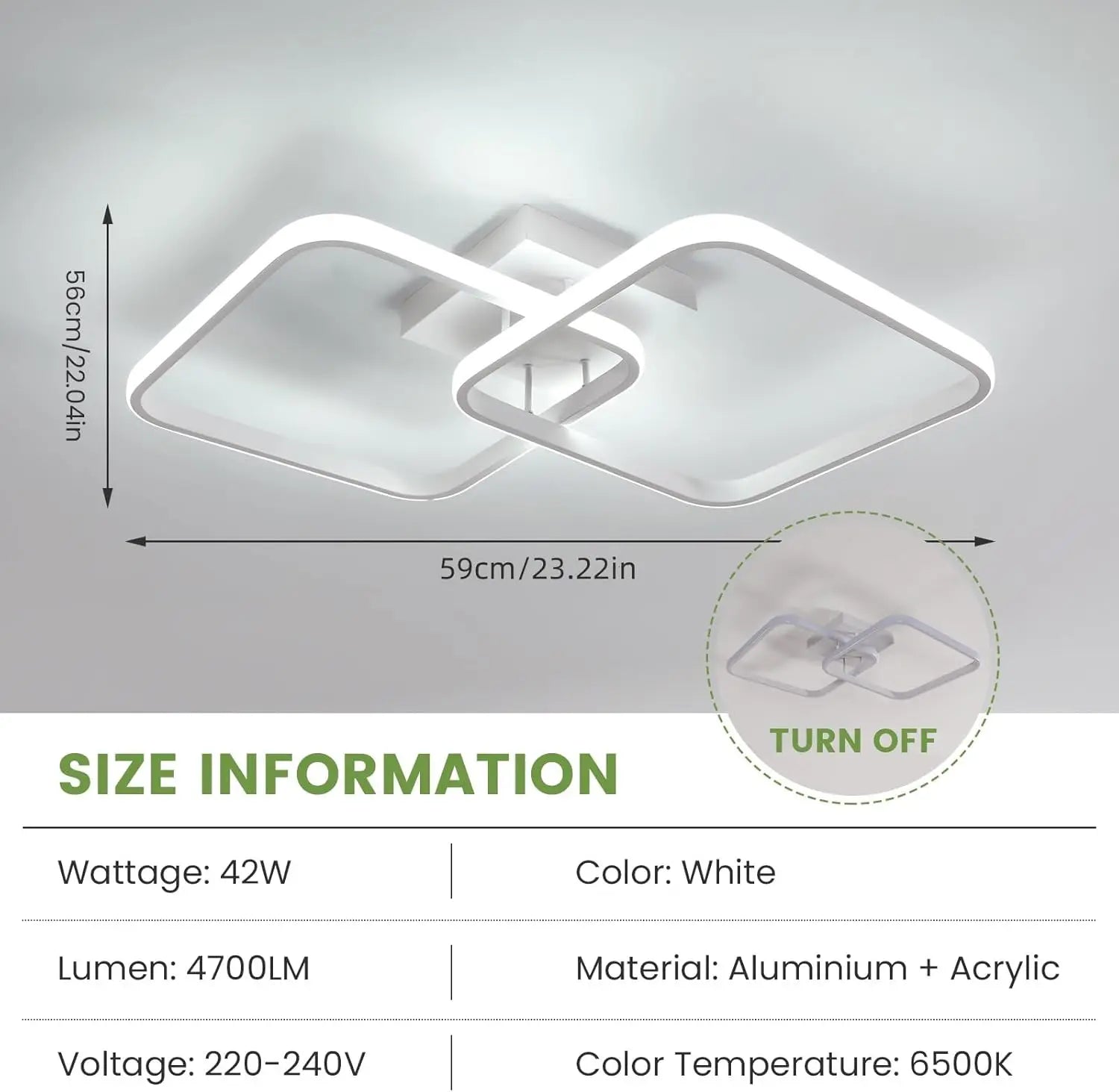 Le plafonnier LED moderne blanc à 2 carrés entrelacés apporte une touche graphique et contemporaine au plafond d’un salon, d’une chambre ou d’un couloir. Les cadres lumineux forment une composition géométrique qui diffuse une lumière homogène, adaptée à l’éclairage quotidien de la pièce.