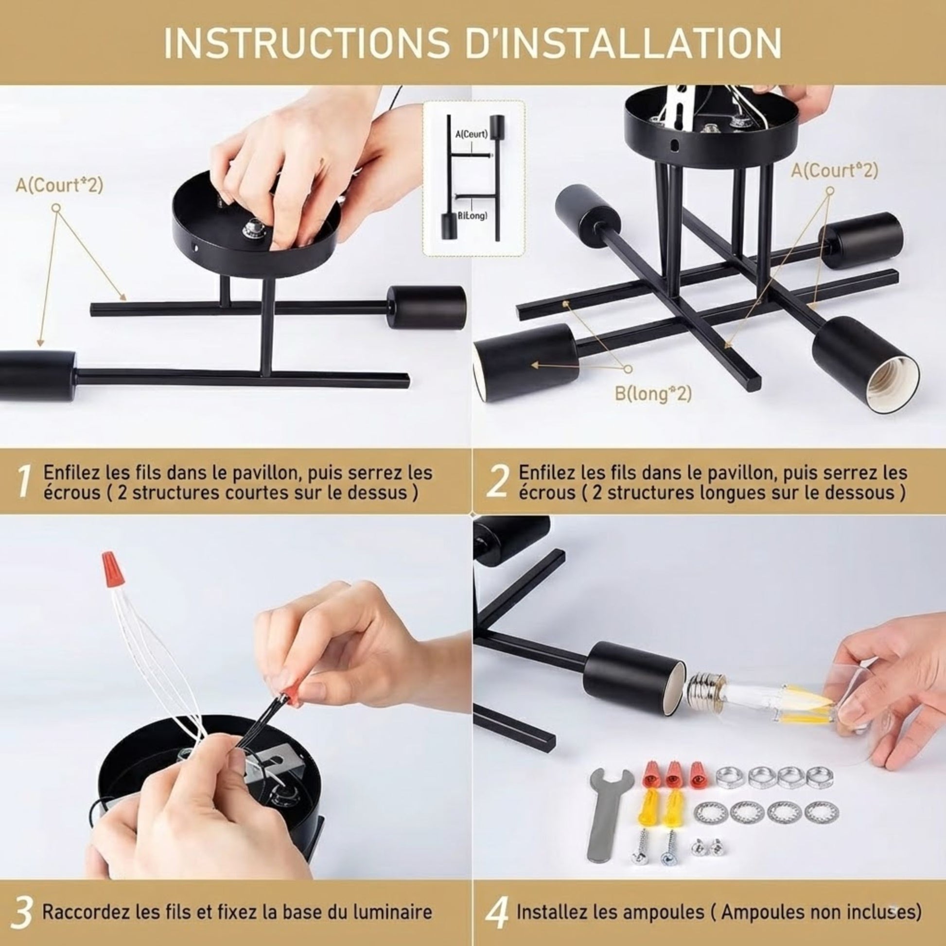 Ce plafonnier type Sputnik se compose de 4 bras avec douilles E27, sur une structure en métal. Le design semi-encastré et les lignes croisées donnent un rendu moderne et graphique au plafond.